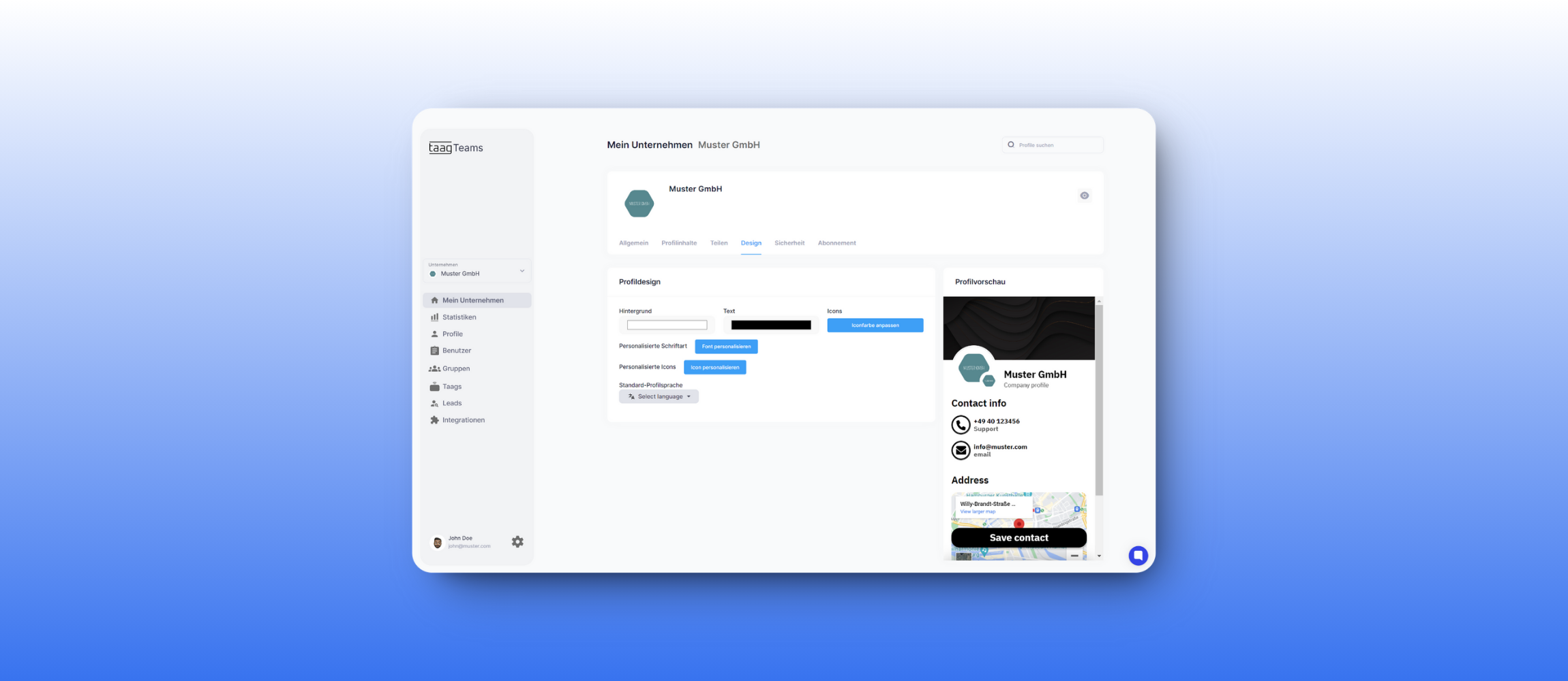Stellen Sie Ihr Corporate Design über MyTaag Teams ein und sorgen Sie für Einheitlichkeit im Design der Profile ihrer Mitarbeiter.