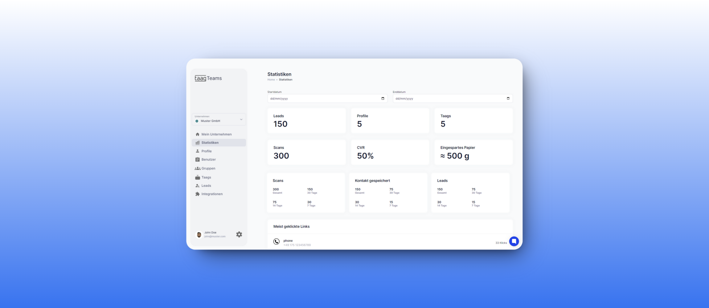 Erhalten Sie einen tiefen Überblick über die Performance Ihres Unternehmens. Analysieren Sie Statistiken zu Leads, Profilen, Links und vieles mehr.